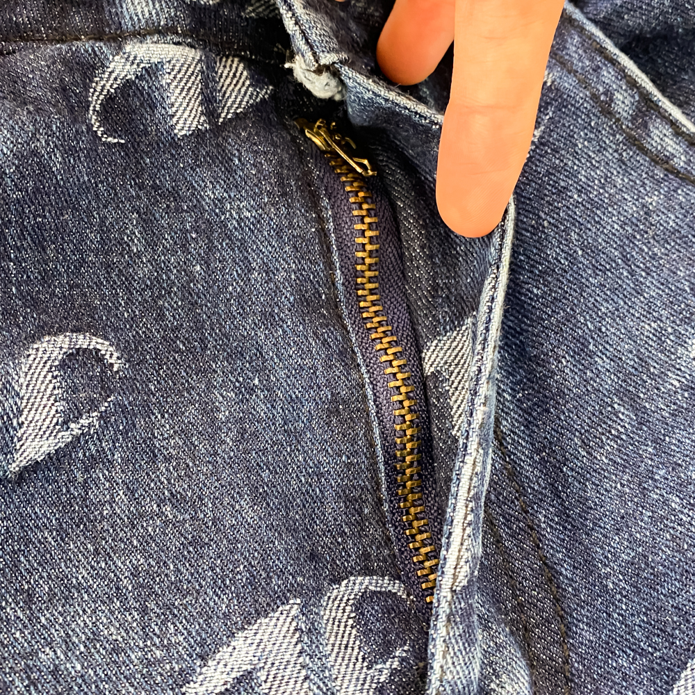 Blue patterned pants with a matching hat on a textured surface with flowers and a hat in the background.